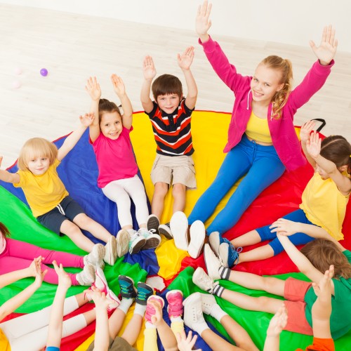 zabawy z chustą edukacyjną, które oddziałują na dzieci wieloma bodźcami: wzrokowym, dotykowym, ruchowym. Zabawy z chustą to ogromna porcja ruchu i dobrej zabawy, a przy tym uczą współpracy, pobudzają wyobraźnię, ćwiczą zwinność i zręczność, sprawność manualną, rozwijają percepcję wzrokową, pamięć oraz małą motorykę.